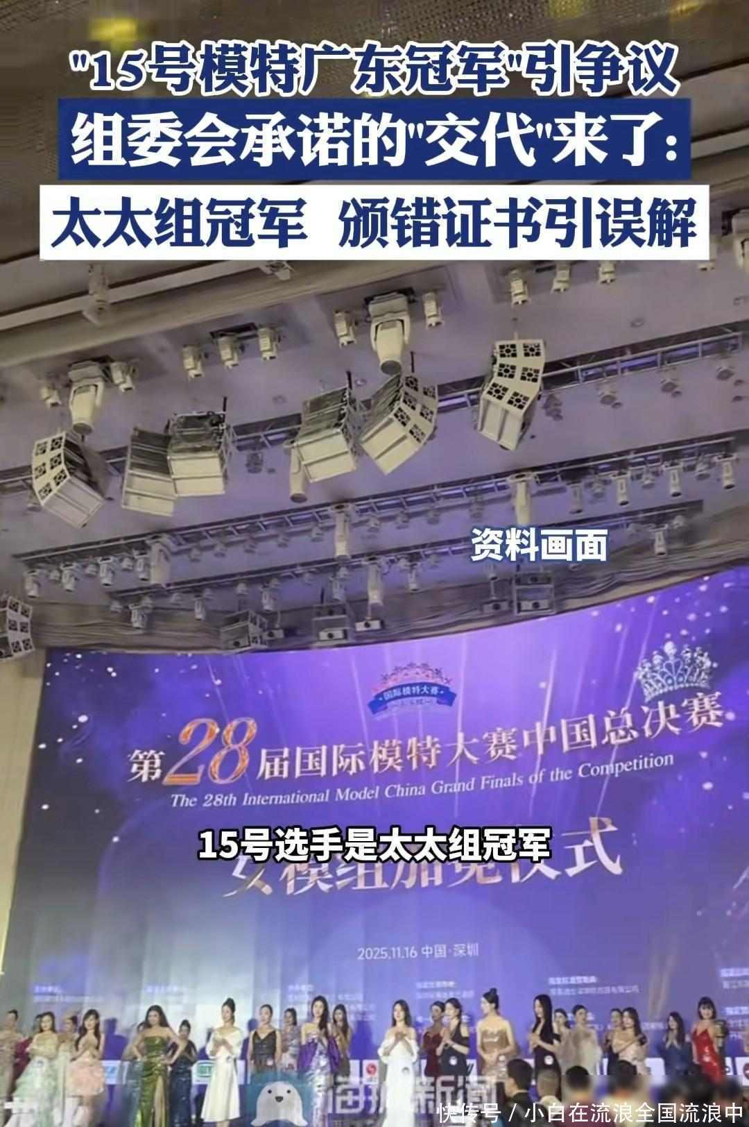 那天比赛结束,主办方发奖状时搞错了,15号选手本来是太太组冠军,结果被当成广东省总冠军发了奖,照片传到网上后大家都懵了,一位五六十岁身材偏胖的阿姨站在T台上笑得挺自信,底下评论都在问这位阿姨怎么拿到第一,热搜直接爆了。